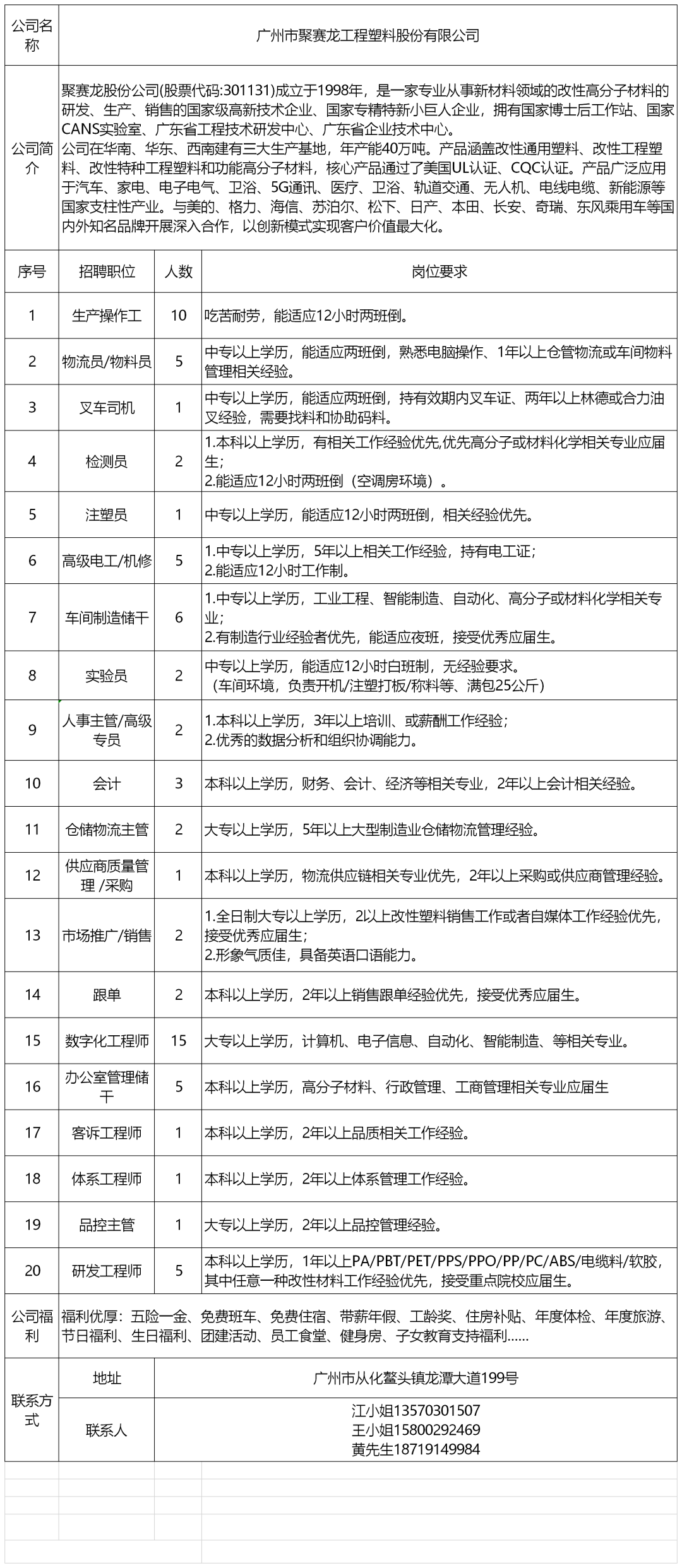 广州市聚赛龙工程塑料股份有限公司招聘