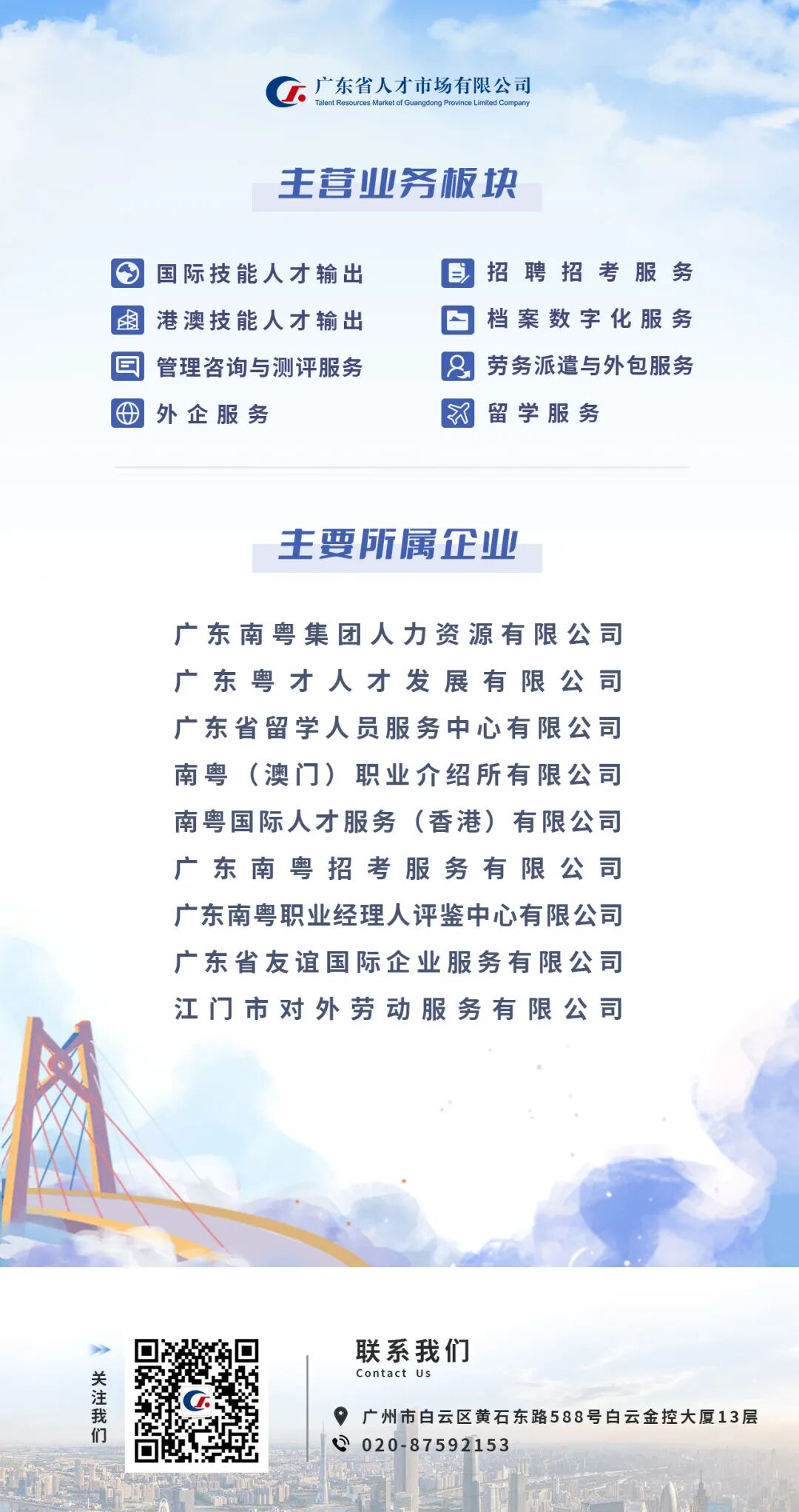广东省人才市场有限公司(下称“省人才市场”)是广东省政府驻澳门窗口单位、省属国企广东南粤集团有限公司的全资企业。公司由广东南粤集团人力资源有限公司与原广东省人才市场合并组建而成。广东南粤集团人力资源有限公司前身是1979年由中华人民共和国对外贸易经济合作部批准成立的广东省劳动服务公司;广东省人才市场前身是1995年由原广东省人事厅设立的广东省人才智力市场(广东省人才实业发展中心),2021年整建制划转至南粤集团。2023年公司重组后,成为广东省属拥有港、澳、国际劳务合作和国内人力资源服务资质全牌照的人力资源国有企业。